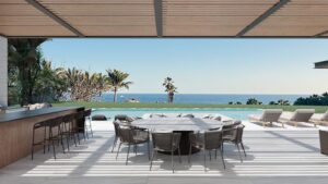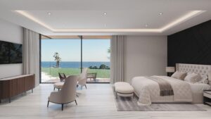 The palette is natural and warm. Stone quarried from nearby mountains, wood treated to withstand ocean air, and glass that reflects the color of the horizon. Interiors flow effortlessly into outdoor spaces—living rooms that open to infinity pools, kitchens that spill into shaded patios, and bedrooms that frame the night sky.
